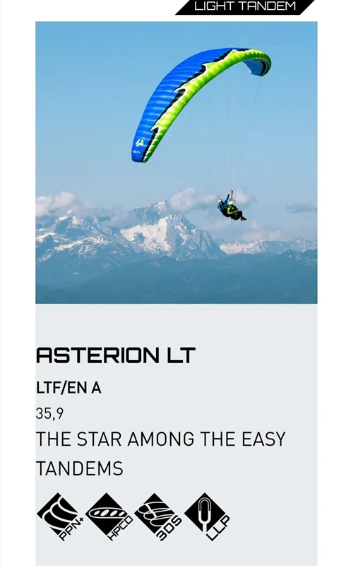 ایمنی غیرفعال سازش ناپذیر راحتی بالایی را در پروازهای طولانی مدت و دو نفره فراهم می کند. ASTERION LT مستقیماً به کنترل پالس ها واکنش نشان می دهد و هندلینگ بسیار دقیقی را ارائه می دهد. این در هنگام اوج گرفتن در بادهای کناری آرام و همچنین هنگام مرکزیت در حرارتی قابل درک خواهد بود. در نتیجه پالسهای فرمان بسیار پایین میمانند و بیشتر به یاد هندلینگ یک بال انفرادی میپردازند. بال که شرایط کامل یک گلایدر خانواده را برآورده می کند. همچنین محدوده وزن با هدف حداکثر انعطاف پذیری در مورد مسافران است.