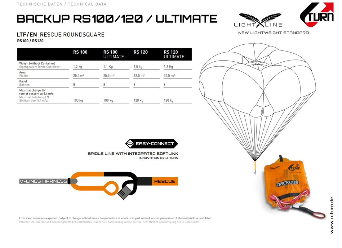سایبان ها را شکل می دهد و از طریق نوآوری های بی شمار توسعه ادامه می دهد. ساخت و ساز جدید مربع گرد نیز چندین آزمایش عملی انجام شد و نتایج شگفت انگیزی را در پروازهای آزمایشی نشان داد. بدین ترتیب ویژگی های مثبت هر دو طرح ساخت و ساز افزایش یافت. مزیت طراحی مخلوط، فرو رفتن بسیار پایدار در مقاومت نوسانی بالا است. از طریق خروجی های هوای اضافی، هوا می تواند به صورت کنترل شده خارج شود و همزمان باز شدن سریع سیستم های نجات و همچنین ثبات را فراهم کند. زمان باز شدن و همچنین نرخ فرورفتن به طور قابل توجهی از طریق محاسبات دقیق در سری BACKUP RS کاهش یافت، بنابراین ما همچنین توانستیم استانداردهای EN و LFT موجود را کاهش دهیم. طول ثابت خطوط به شدت بسته بندی نجات را ساده می کند و به راحتی از طریق کدگذاری رنگ مرتب می شود. یکی دیگر از نوآوری های U-Turn اتصال آسان است. از طریق یک پیوند نرم یکپارچه، افسار اصلی BACKUP RX را می توان به هر اتصالی منظم و آسان متصل کرد.